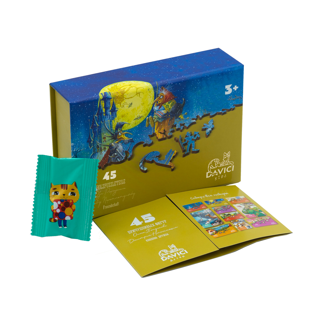 Freundschaft. Kollektion DaVICI Kids. KstlerIn Olga Popugaeva, Dmitry Nepomnyashchy DAVICI ist der aus Russland stammende Vorreiter im Bereich von Holzpuzzles mit fantasie-vollen Formen. Wie ein Buch erzlt die Box in deinen Hden die Geschichte der Kunstwerke mit Helden, Mchen und rselhaften Handlungen. DaVICI steht f einzigartige Puzzles aus hochwertigem Birkenholz mit extravaganten Formen und Liebe zum Detail. Durch prises Laserschneiden passen die aufwendig geformten Teile perfekt ineinander. In dieser Welt der Puzzles erwachen Menschen, Vel und wilde Tiere, Kige und Wanderer, Sterne und Plane-ten zum Leben. Die Motive der Puzzles basieren auf Gemden gror russischer Kstler. Das Gemde des Kstlers ergibt in Kombination mit den Puzzleteilen, die auf die Geschichte des Autors abgestimmt sind, ein vollkommenes Meisterwerk. Beim Zusammensetzen der intellek-tuellen DAVICI Puzzles tauchst Du in eine erstaunliche Welt voller Illusionen, Geheimnisse und Mysterien ein. Ein haptisches Vergnen mit grortigen Details und angenehmem Duft nach Holz. Die Puzzles von DAVICI schaffen wundervolle Erinnerungen und kostbare Gefle, und beleben etwas, das wirklich wertvoll ist.
