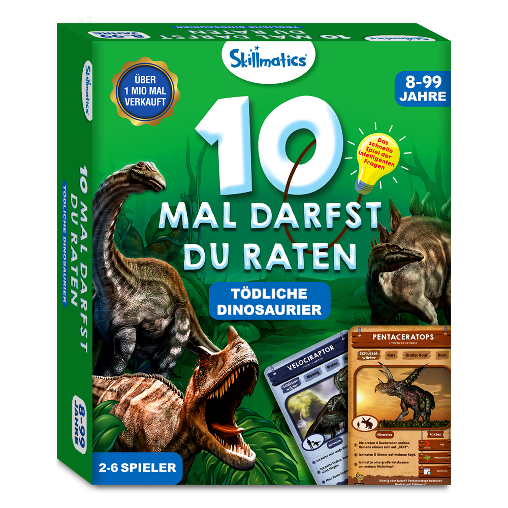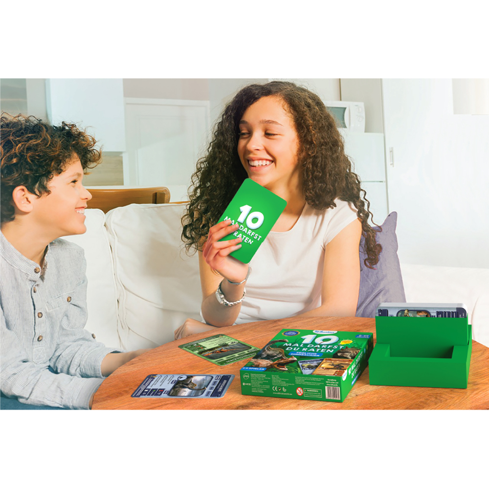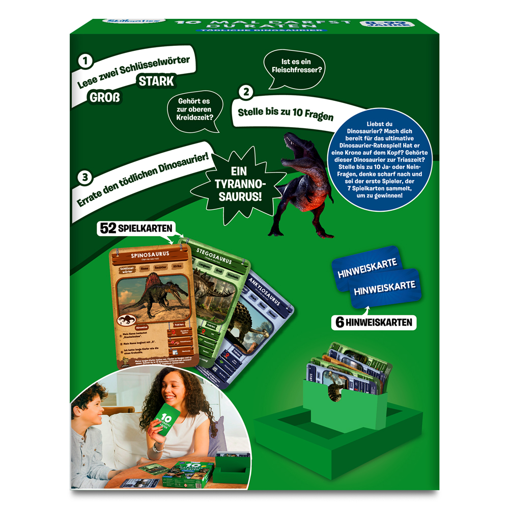"Ein fesselndes Fragespiel erwartet dich - deine Mission: Errate den Dinosaurier auf der Spielkarte! Du kannst bis zu zehn geschickte Fragen stellen, deine Überlegungen sorgfältig anstellen und deine Hinweiskarten taktisch nutzen, um der Erste zu sein, der sieben Spielkarten ergattert. Sei bereit für ein aufregendes Abenteuer in der Welt der Dinosaurier!"