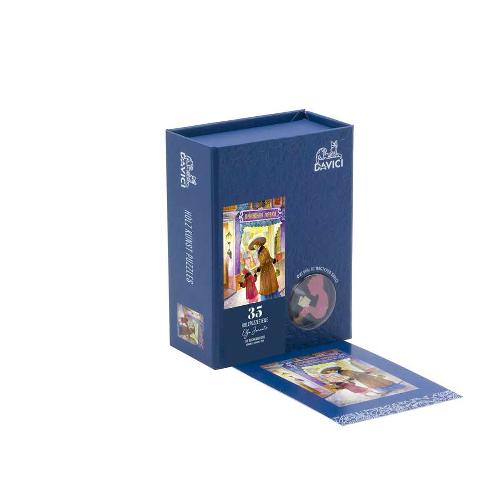 Die Buchhandlung. Display Kollektion. KstlerIn Olga Jonaitis. Aquarell, Gouache, 2006 DAVICI ist der aus Russland stammende Vorreiter im Bereich von Holzpuzzles mit fantasie-vollen Formen. Wie ein Buch erzlt die Box in deinen Hden die Geschichte der Kunstwerke mit Helden, Mchen und rselhaften Handlungen. DaVICI steht f einzigartige Puzzles aus hochwertigem Birkenholz mit extravaganten Formen und Liebe zum Detail. Durch prises Laserschneiden passen die aufwendig geformten Teile perfekt ineinander. In dieser Welt der Puzzles erwachen Menschen, Vel und wilde Tiere, Kige und Wanderer, Sterne und Plane-ten zum Leben. Die Motive der Puzzles basieren auf Gemden gror russischer Kstler. Das Gemde des Kstlers ergibt in Kombination mit den Puzzleteilen, die auf die Geschichte des Autors abgestimmt sind, ein vollkommenes Meisterwerk. Beim Zusammensetzen der intellek-tuellen DAVICI Puzzles tauchst Du in eine erstaunliche Welt voller Illusionen, Geheimnisse und Mysterien ein. Ein haptisches Vergnen mit grortigen Details und angenehmem Duft nach Holz. Die Puzzles von DAVICI schaffen wundervolle Erinnerungen und kostbare Gefle, und beleben etwas, das wirklich wertvoll ist.