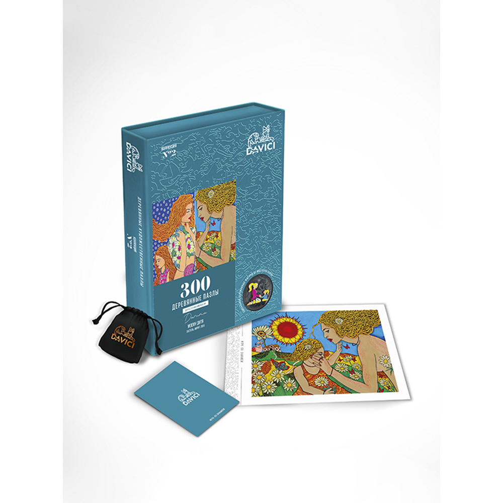 "Für mein Kind (Zweiseitiges Set). Kollektion Nr. 2. KünstlerIn Daruma. Pastell, Akryl, 2018.Die zweiseitigen DaVici Puzzles sind etwas ganz Besonderes! Hier hat man zwei Motive in einem Puzzle. Du kannst entscheiden, welches Bild du zuerst puzzeln möchtest. Durch die beidseitige Bedruckung ist es gar nicht so einfach, die richtigen Teile zu finden. Doppeltes Motiv - Doppelte Knobelei - Doppelter Spaß! .DAVICI ist der aus Russland stammende Vorreiter im Bereich von Holzpuzzles mit fantasie-vollen Formen. Wie ein Buch erzählt die Box in deinen Händen die Geschichte der Kunstwerke mit Helden, Märchen und rätselhaften Handlungen. DaVICI steht für einzigartige Puzzles aus hochwertigem Birkenholz mit extravaganten Formen und Liebe zum Detail. Durch präzises Laserschneiden passen die aufwendig geformten Teile perfekt ineinander. In dieser Welt der Puzzles erwachen Menschen, Vögel und wilde Tiere, Könige und Wanderer, Sterne und Plane-ten zum Leben. Die Motive der Puzzles basieren auf Gemälden großer russischer Künstler. Das Gemälde des Künstlers ergibt in Kombination mit den Puzzleteilen, die auf die Geschichte des Autors abgestimmt sind, ein vollkommenes Meisterwerk. Beim Zusammensetzen der intellek-tuellen DAVICI Puzzles tauchst Du in eine erstaunliche Welt voller Illusionen, Geheimnisse und Mysterien ein. Ein haptisches Vergnügen mit großartigen Details und angenehmem Duft nach Holz. Die Puzzles von DAVICI schaffen wundervolle Erinnerungen und kostbare Gefühle, und beleben etwas, das wirklich wertvoll ist."