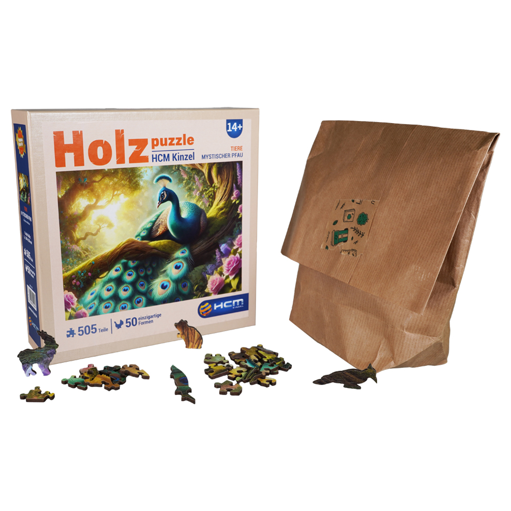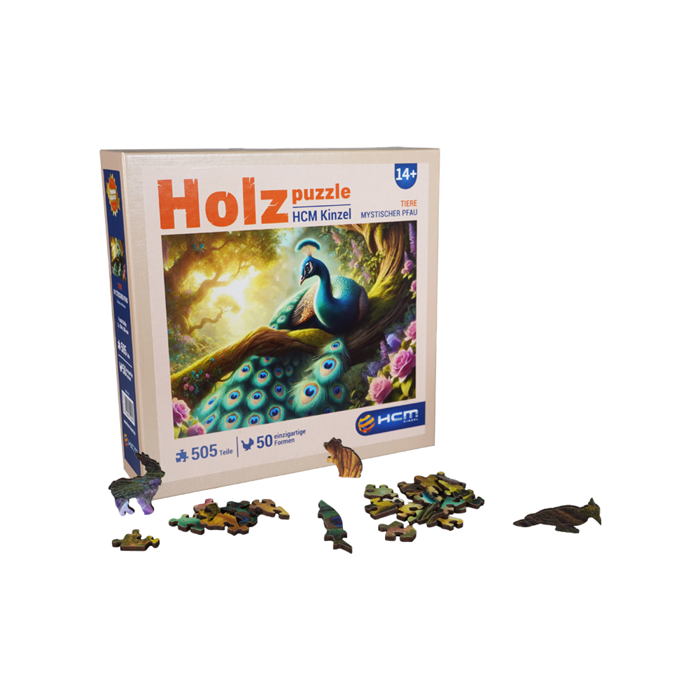 Sichere dir jetzt das HCM Kinzel Holzpuzzle Mystischer Pfau und genie ein einzigartiges, anspruchsvolles Puzzle-Erlebnis mit kstlerischem Flair!