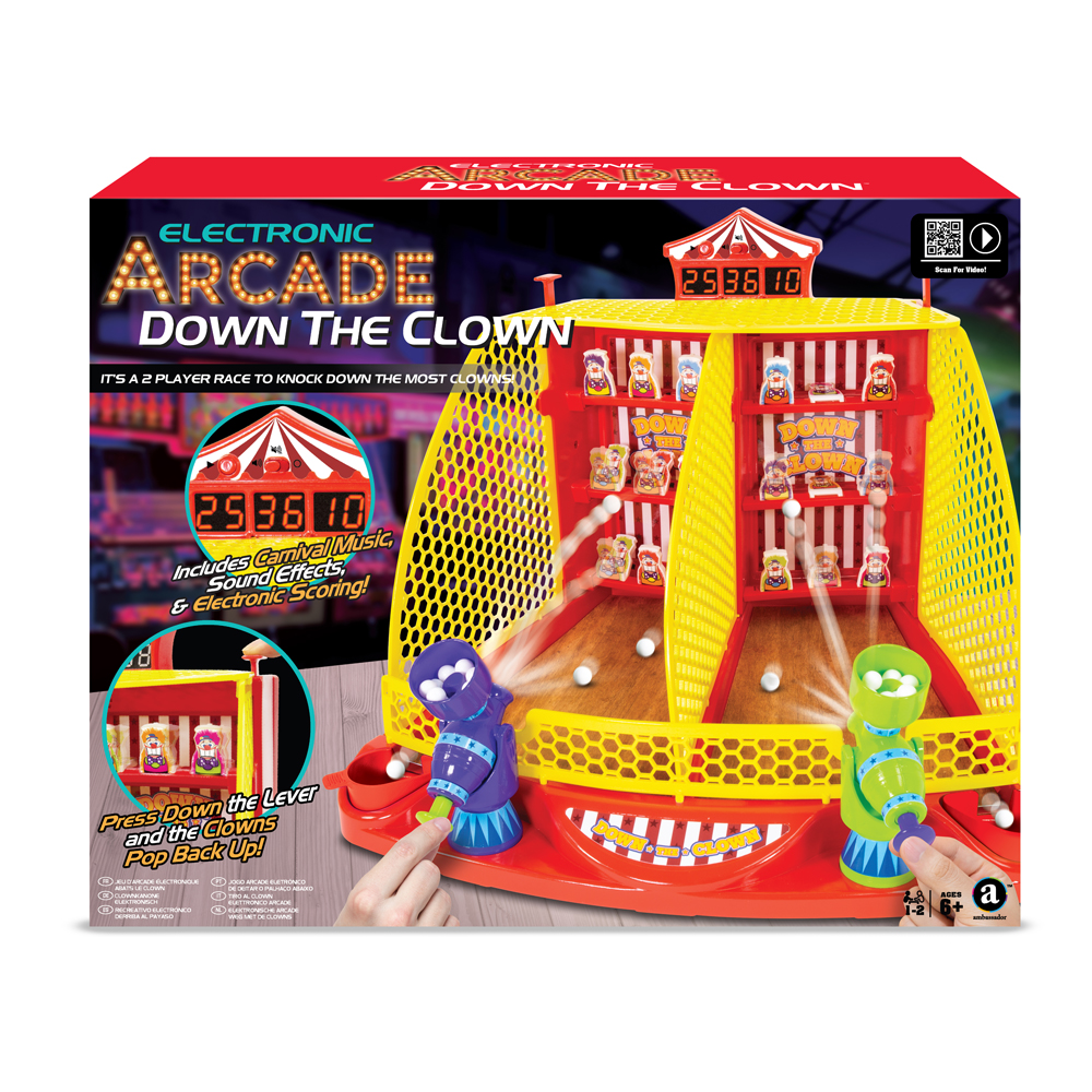 Diese modernisierte Version bringt eines der beliebtesten Jahrmarktspiele direkt zu dir nach Hause! 2 Spieler spielen um die Wette und versuchen, innerhalb 60 Sekunden so viele Clowns wie mlich zu treffen. Mit tollem Sound und gror LED-Tafel, auf der die verbleibende Zeit und die Punkte f jeden Spieler angezeigt werden.