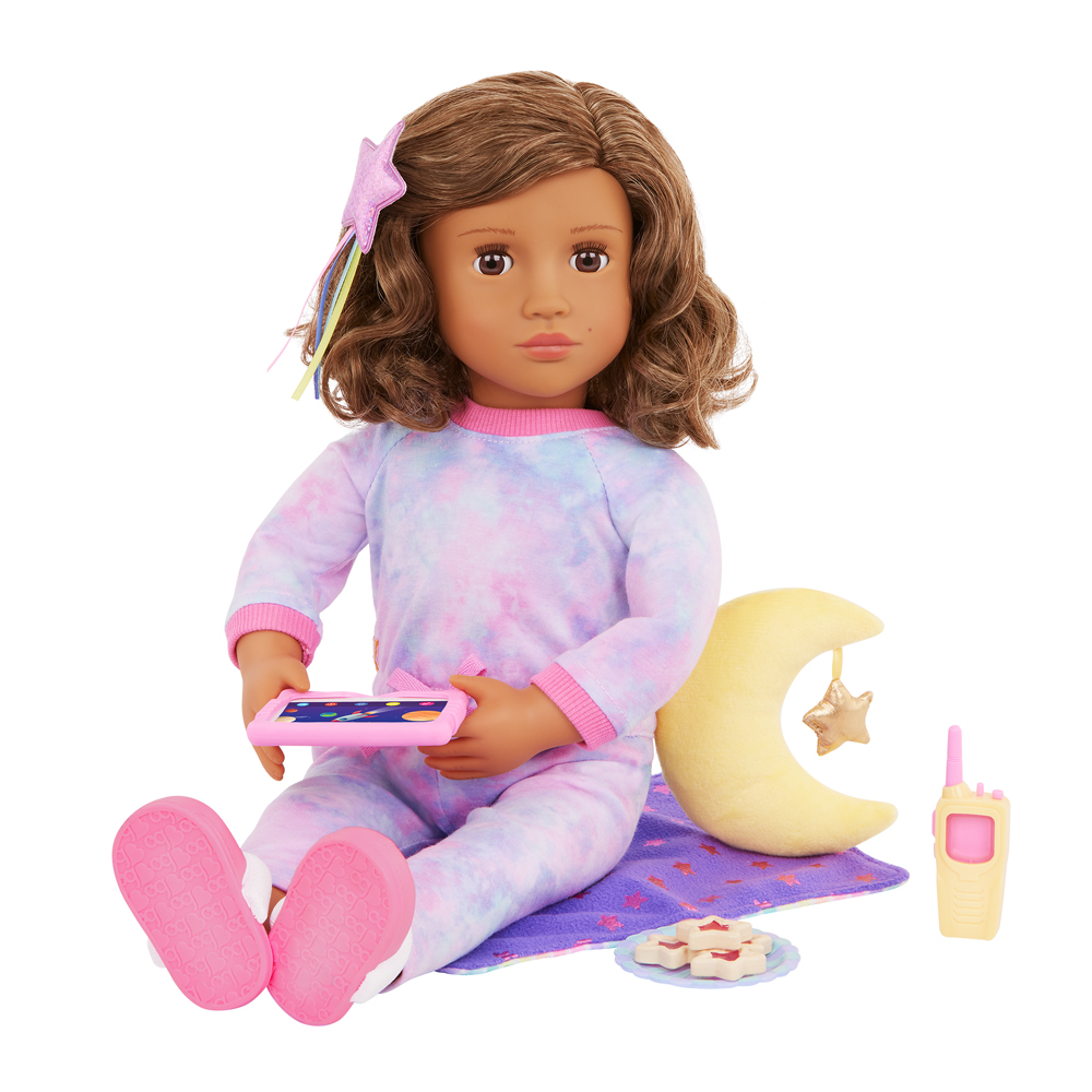 Verdopple den Spabei ernachtungspartys mit Luna und ihrem Bilderbuch! Diese Our Generation 18-Zoll Puppe kommt mit Schlafanzug-Zubeh wie einer Decke, einem Mondkissen, einem Cluster von Keksen, einem Spiel-Tablet und einem Walkie-Talkie. Ihr illustriertes Kapitelbuch lst Kinder mitlesen und mitspielen, wrend sie ihr Abenteuer nachspielen! Luna ist auch eine posierbare Puppe. Sie kann ihre Arme und Beine biegen, um lustige Posen wrend des Erzlens zu kreieren. Sie hat einen kuscheligen, weichen Kper, welliges braunes Haar, das sich prima stylen lst, und lebensechte hellbraune Augen, die sich wirklich schlien, wenn es Zeit f se Trme ist! Luna ist bereit f die ernachtungsparty und trt einen bunte Farbverlauf-Pyjama-Anzug mit sen Hausschuhen und einem Sternen-Haarclip. Die Our Generation Puppen- und Buch-Sets sind ein tolles Geschenk f Kinder ab 3 Jahren und fdern ihre Fantasie, wrend sie eigene, einzigartige Geschichten erfinden.