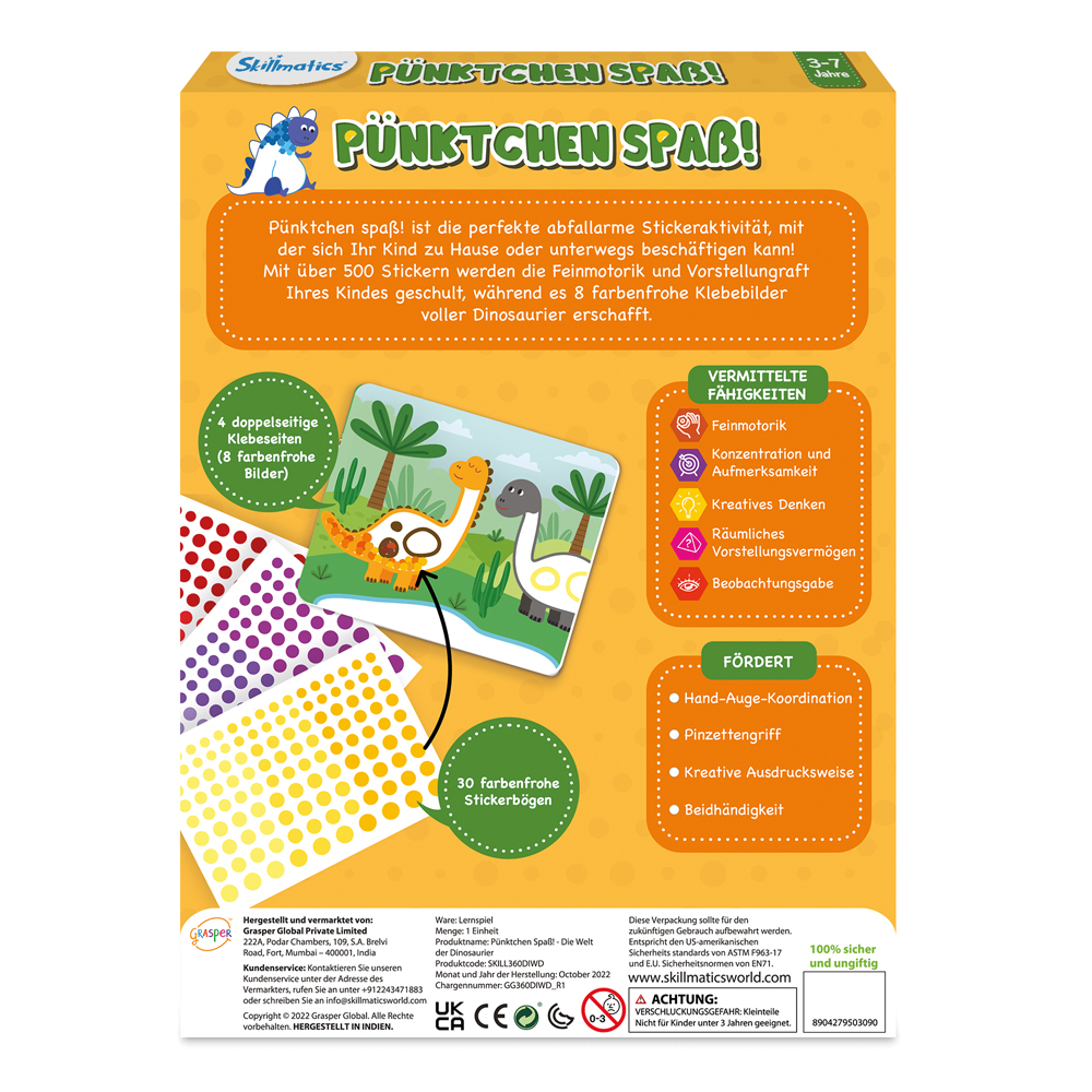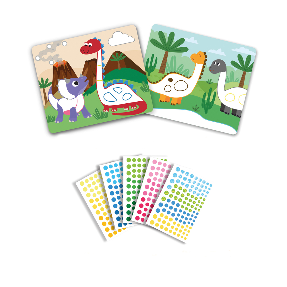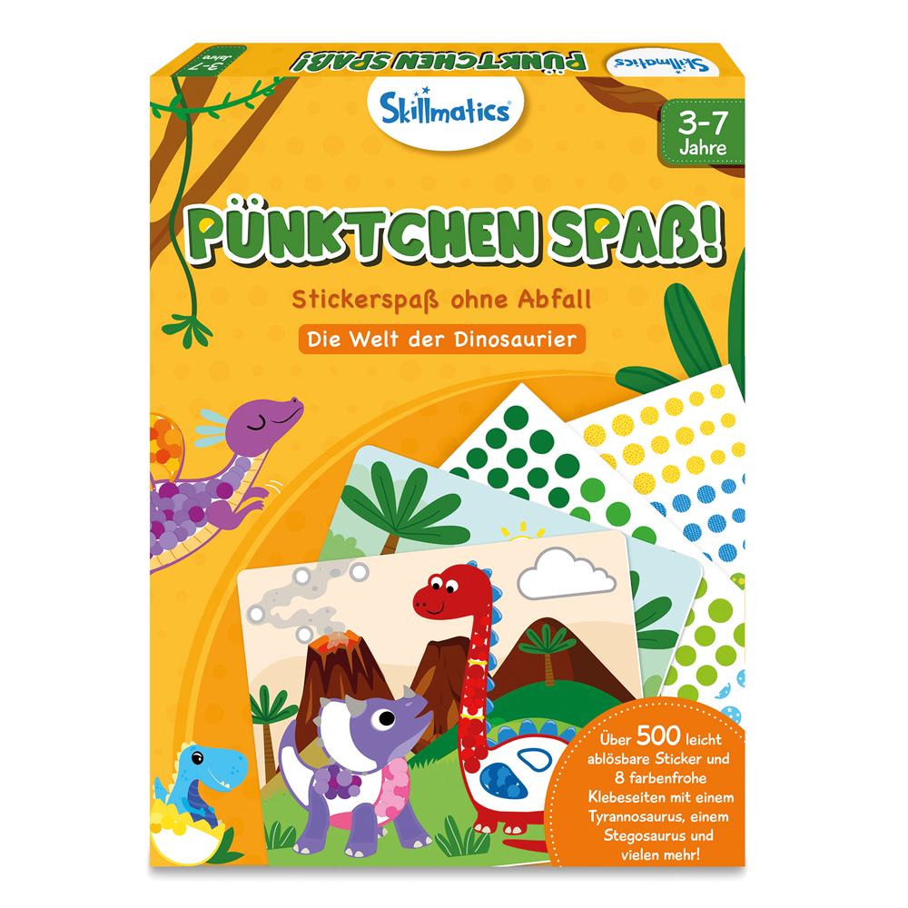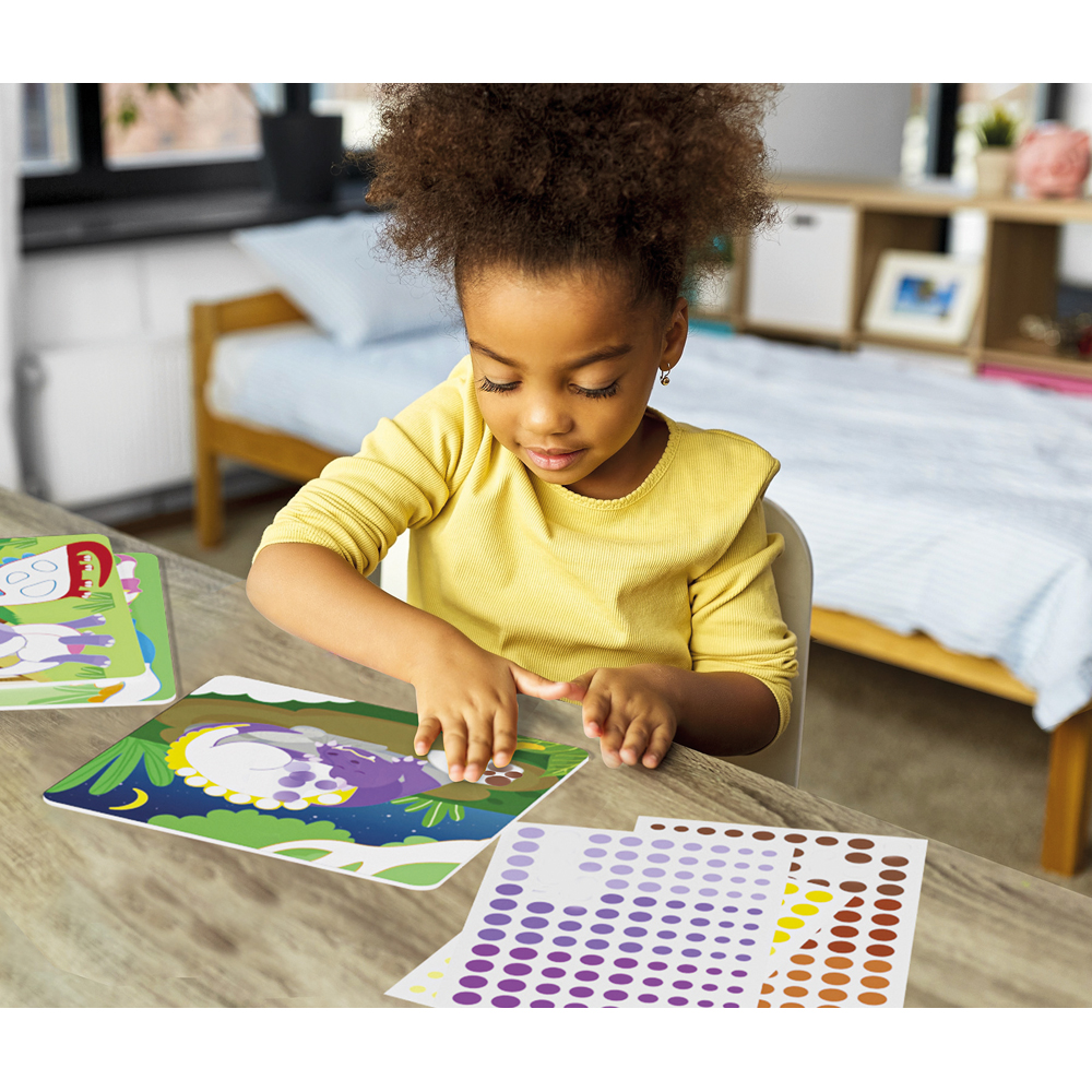 "Pünktchen Spaß! Ist die perfekte Stickerkunst ohne Saubermachen für zuhause und unterwegs. Mit über 500 Stickern wird die Feinmotorik und Vorstellungskraft Ihres Kindes geschult während es Klebebilder voller Dinosaurier erschafft."