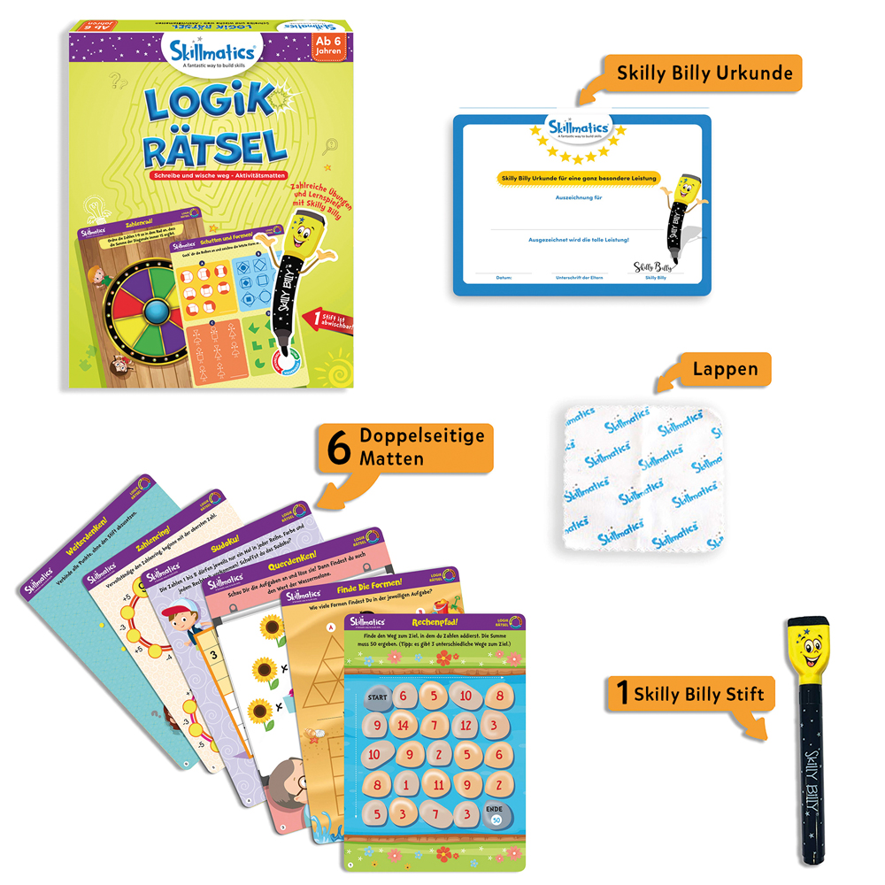 "Mit Skillmatics „Logik Rätsel“ lernen Kinder das logische Denken durch spannende Herausforderungen. Unsere Rätsel sind speziell entwickelt worden, um logisches und problemlösendes Denken mithilfe spielerischer Lernmethoden zu fördern. Dieses Set enthält innovative Aktivitäten, die gleichermaßen für Kinder und Erwachsene geeignet sind."